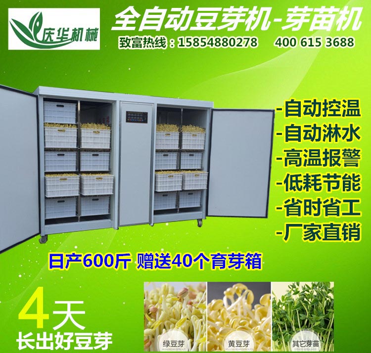 5、豆芽機產(chǎn)品特點: 1)我公司生產(chǎn)的全自動綠色無污染豆芽機,是現(xiàn)代技術與傳統(tǒng)工藝的結合。豆芽機通過微電腦自動控溫、自動加溫、自動顯示溫度、自動淋水,實現(xiàn)了生產(chǎn)過程的全自動化,具有省時、省工、低耗、無噪音等特點。 2)用我公司豆芽機生產(chǎn)的豆芽比傳統(tǒng)手工生產(chǎn)周期短質量好,一般手工生產(chǎn)豆芽的周期,夏季需4-5天,冬季需要7-8天,而豆芽機生產(chǎn)豆芽只要3-4天即可,且不受地理環(huán)境、氣候條件和季節(jié)的影響。 3)我公司豆芽機生產(chǎn)的豆芽不僅種類多,而且產(chǎn)量高,一斤豆種可生產(chǎn)10斤左右的豆芽。且人工控制的環(huán)境下,豆芽生長均勻一致,潔白鮮嫩、清脆多汁,口感清爽;不僅食用安全、營養(yǎng)豐富,還具有一定的食療保健作用。 4)節(jié)省勞力,操作方便。將浸泡后的豆種放進豆芽機育芽箱內,就不用管了,它會自動加溫,自動淋水,經(jīng)過3-4天時間就可生產(chǎn)出潔白脆嫩的豆芽。 5)減少爛芽現(xiàn)象。豆芽生長的爛芽現(xiàn)象多發(fā)生在培育后的三天左右,由于手工生產(chǎn)豆芽的周期長,易出現(xiàn)爛芽現(xiàn)象,然而采用豆芽機生產(chǎn),三天左右豆芽已經(jīng)成熟,可以采收食用,不會有爛芽現(xiàn)象發(fā)生。