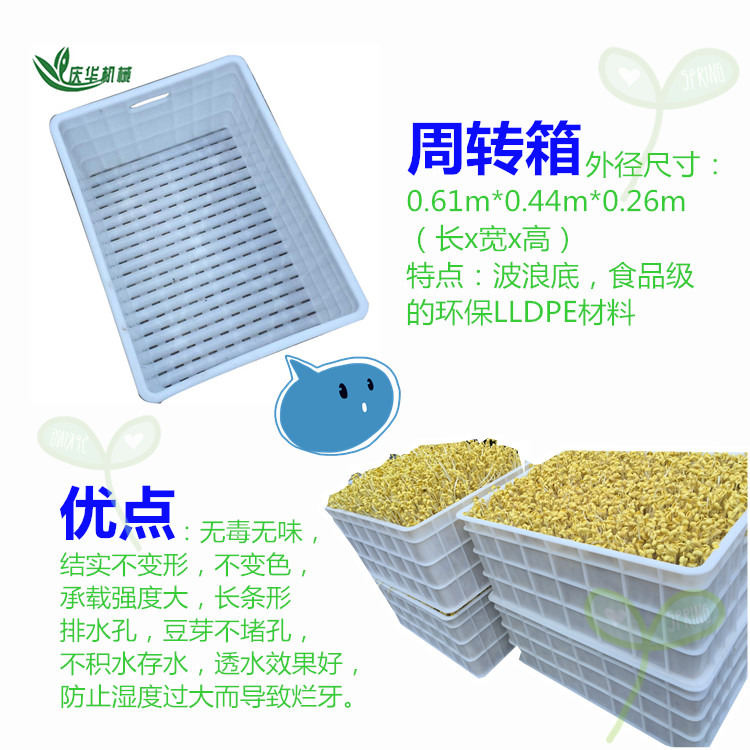 6、豆芽機結(jié)構(gòu)特點及功能(可根據(jù)客戶需要訂做): 4)周轉(zhuǎn)箱的外徑尺寸:0.61m*0.44m*0.26m(長寬高),特點:波浪底,食品級的環(huán)保LLDPE材料,無味,結(jié)實不變形,不變色,承載強度大,長條形排水孔,豆芽不堵孔,不積水存水,透水效果好,防止?jié)穸冗^大而導(dǎo)致爛牙。