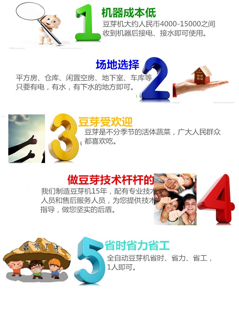3、豆芽生產(chǎn)流程: 選擇芽豆 →→ 對豆種清洗并做無菌處理 →→ 浸種(適宜水溫) →→ 裝機(每箱約5斤干豆) →→ 啟動豆芽機,設(shè)定合理參數(shù) →→ 對育芽室做無菌處理 →→ 1天后觀察豆芽生長情況 →→ 2天后觀察豆芽生長情況 →→ 3天后觀察豆芽情況 →→ 4天后收獲豆芽 →→ 豆芽清洗后包裝,上市。